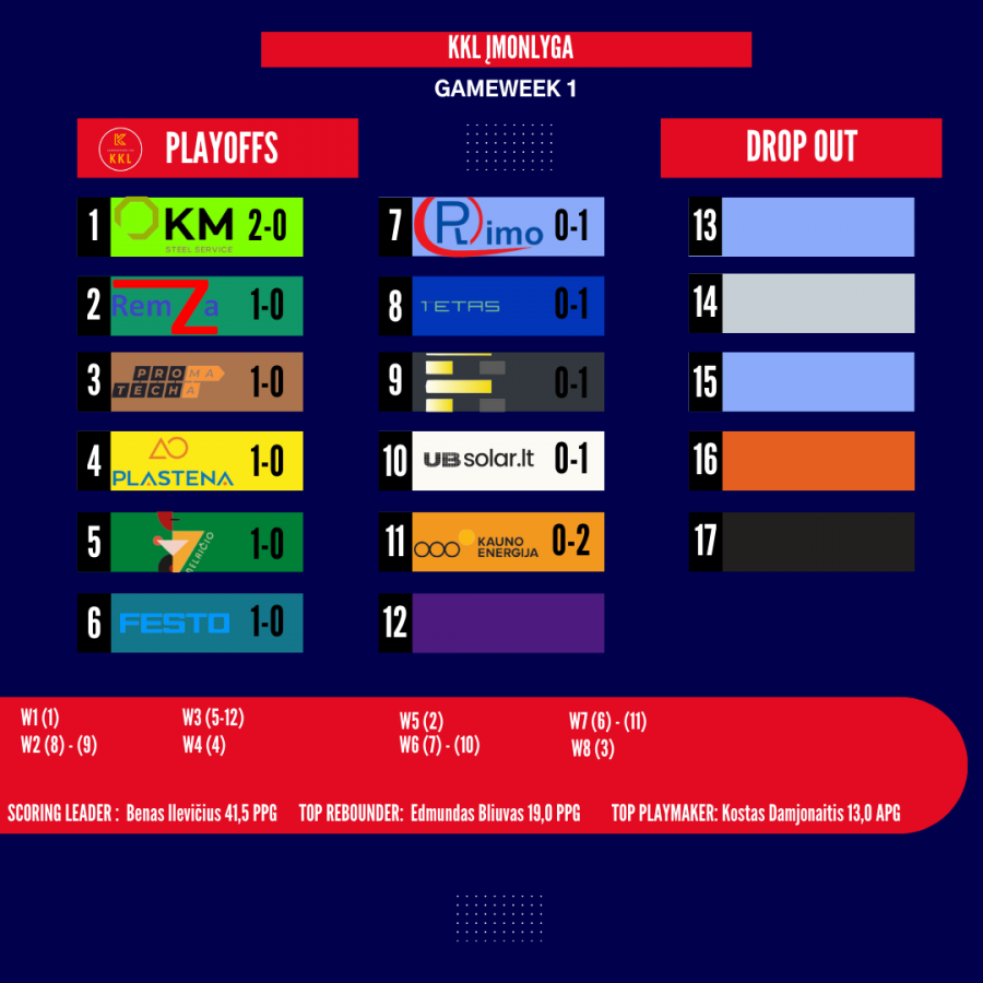 KKL Įmonių lyga, virsta savotiška Įmonlyga, kadangi pirmajame etape visos komandos žaidžia vienoje 17 komandų grupėje. Nors pirmoji savaitė buvo kreivoka ir dar ne visos komandos spėjo startuoti, tačiau išryškėjo KM Steel Service lyderystė, kuri iškovojo pirmąsias dvi pergales. Tiesa ir pernai Steel Service turėjo gerą sezono startą, kur po pirmų keturių rungtynių turėjo startą (3-1), tačiau sezono eigoje rezultatai sumenko, o Plieno paslaugos krito dar pirmajame atkrintamųjų raunde.